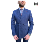 Colore blu scuro, doppiopetto con rever a lancia interamente impunturato.