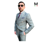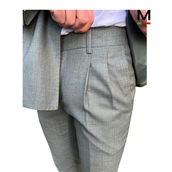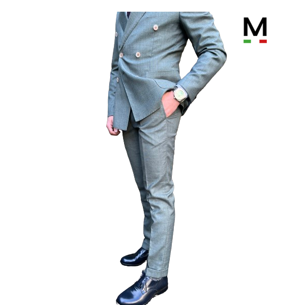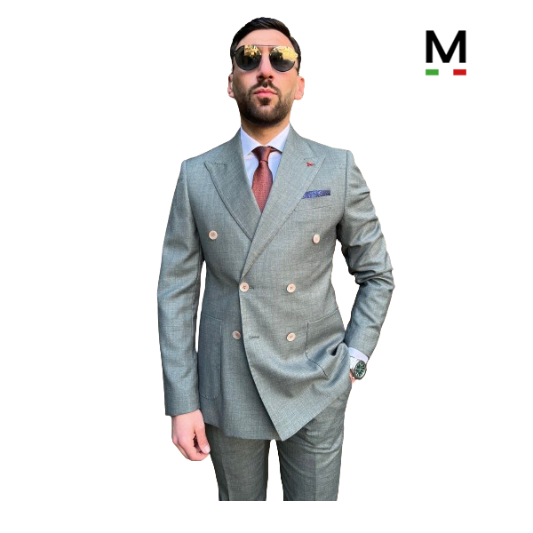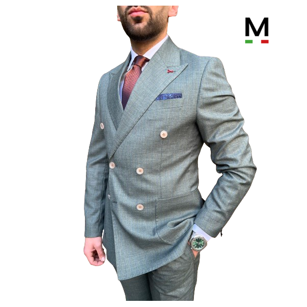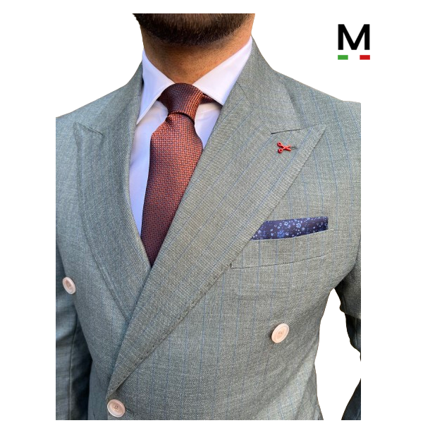 Colore verde militare, con riga bluette, doppiopetto con rever a lancia interamente impunturato.